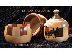Houtdraaiwerk: decoratie voorwerpen, garen kommen (voor brei-en haakwerk) en kandelaars.